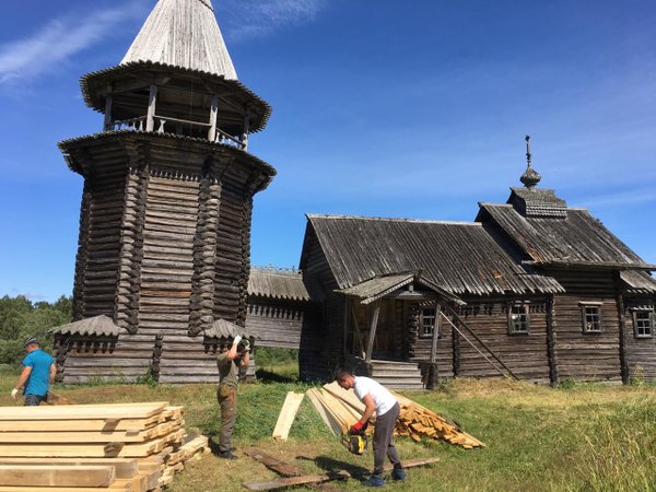 ционное покрытие на кровлях молельной части, трапезной и алтаре Храма. Руководил процессом работ ведущий специалист Всероссийского центра сохранения деревянного зодчества им В.С.Рахманова Александр Юрьевич Любимцев при поддержке Архитектурно-Реставрационного Цента «Заонежье». На следующий год запланирована экспедиция для работ на колокольне.