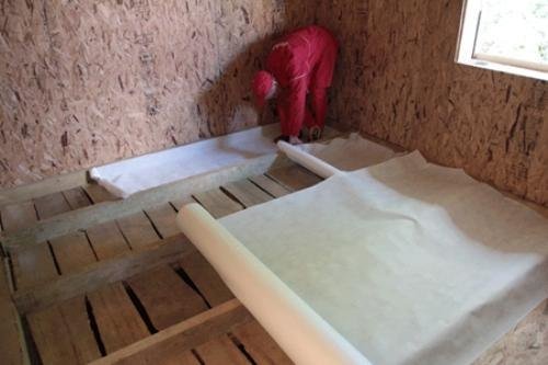 Приклеиваем ее к стене и между собой. Пленка должна укладываться так, чтобы она немного провисала, образовывая тем самым воздушную прослойку между чистовым покрытием пола и пароизоляцией. Для соединения двух полотен пленки нужно использовать специальную монтажную ленту (Ондутис BL) или двухсторонний скотч. Соединительный шов должен совпадать с лагой. В таком случаи утеплитель будет надежно защищен от конденсата. Минимальный нахлест пленки должен быть 10 см. Если пленку нужно соединить по длине, нужно использовать туже монтажную ленту. Категорически запрещается соединять пленку между собой с помощью степлера. В этом случаи будет образовываться щели через которые влага проникнет в утеплитель и паробарьер будет не эффективным. Теперь можно приступать к монтажу чистового пола из досок. Так же можно уложить фанеру под паркет или же ламинат.