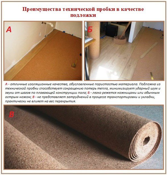 а не выравнивает мелкие изъяны черновой поверхности, устранение которых нецелесообразно проводить путем очередной заливки стяжки; предотвращает загрязнение замковой системы ламината пылью, выделяемой верхним слоем свежезалитой бетонной основы в процессе эксплуатации; является отсекающим элементом, необходимым для монтажа напольного покрытия по плавающей схеме; играет роль гидроизоляционного барьера, сокращающего воздействие влаги на незащищенную тыльную сторону ламинированных плашек; способствует равномерному распределению механической нагрузки; минимизирует шумовые эффекты, возникающие при ходьбе по плавающему полу и при падении предметов. В связи с бюджетной стоимостью ламината строители считают применение пробковой подложки нерациональным предприятием. Дескать, цена 1м² пола тогда увеличивается в 1,5—2 раза, да еще и прослужит покрытие гораздо меньше, чем «подкладка» под него. Вспомним о том, что сооружаем мы пол для себя. Позаботимся о своем здоровье, ведь прослойка не будет выделять токсинов и копить аллергенов. Не забудем о том, что никто не запрещает нам поверх отлично сохранившейся технической пробки вновь уложить свеженький ламинат или благородный штучный паркет. Кроме долгосрочной эксплуатации и экологических плюсов прослойки, созданной из натурального исходного сырья, в пользе приобретения пробки убеждают: легкость раскроя, минимум труда в процессе укладки; идеальное сохранение формы по всем направлениям; отсутствие трещин, выкрошенных изъянов, вмятин, вспученных выпуклостей, возникающих при некорректной эксплуатации иных материалов из органики; сопротивляемость возгоранию и последующему распространению огня; антистатические свойства; легковесность, благодаря которой общая масса конструкции пола увеличивается незначительно; высокая пористость, придающая материалу оптимальные изоляционные качества. Обработанная антисептическими пропитками пробка не интересна грибкам. Не привлекает она жуков-короедов, не вызывает аппетит у грызунов. Вообще все прекрасно кроме цены, но и с ней можно смириться, т.к. сумма эксплуатационных плюсов, помноженных на долгосрочность, убеждает в весьма выгодном вложении средств. Конкретно о пробке и о способах ее укладки Основным исходным сырьем в производстве данного материала является кора пробкового дуба, переработанного в крошку. Из крошки прессуется агломерат заданной изготовителем толщины. В качестве связующего вещества применяется естественная клейкая составляющая коры суберин в классическом варианте продукции или его искусственные заменители в модернизированных изделиях. Материал поставляется в рулонах с толщиной от 2 мм или в листах с толщиной от 4 мм. Стоимость технической пробки настойчиво подсказывает, что в тандеме с ней желательно использовать недешевые марки ламината с толщиной досок от 8 мм. Последний параметр влияет на подбор подложки. Под 8ми-миллиметровые доски достаточно настелить подкладку в 2 мм толщиной, под более толстое покрытие в 3мм. Превышать последний из указанных лимитов производители и строители не советуют даже в случае использования сверхпрочного ламината коммерческого класса. При передвижении по полу толстая подложка будет пружинить, что приведет к расшатыванию и поломке замков.