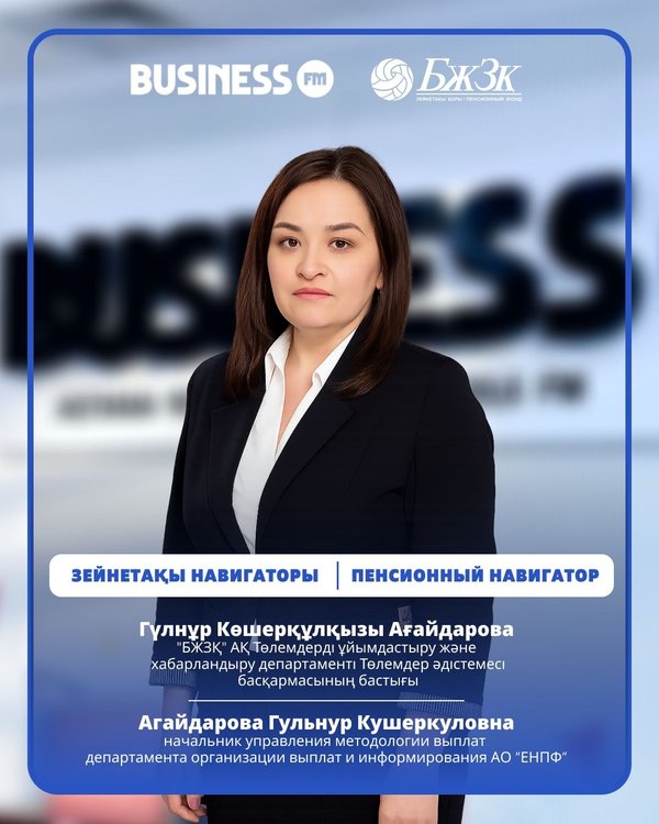ЗЕЙНЕТАҚЫ НАВИГАТОРЫ Айжан Темірлан «БЖЗҚ» АҚ Стратегиялық даму департаментінің Стратегия және талдау басқармасының бастығы 08:20 бастап 30 қазан Almaty 89.6 FM Astana 105.4 FM Shymkent 107.7 FM ____ ПЕНСИОННЫЙ НАВИГАТОР Гость эфира: Айжан Темирлан начальник управления стратегии и анализа департамента стратегического развития АО «ЕНПФ» с 08:20 30 октября Almaty 89.6 FM Astana 105.4 FM Shymkent 107.7 FM