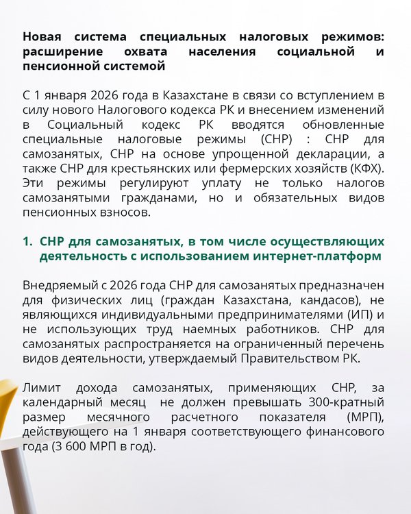 2026 ж. 1 қаңтардан өзін-өзі жұмыспен қамтығандар, оңайлатылған декларация негізіндегі, шаруа немесе ФҚ үшін енгізілетін арнайы салық режимдері мен зейнетақы жарналары