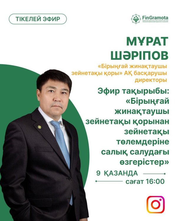 Дорогие друзья! Приглашаем вас на прямой эфир в Instagram! Тема эфира — «Изменения в налогообложении пенсионных выплат из ЕНПФ». Спикер – Мурат Шарипов, управляющий директор АО «ЕНПФ» В ходе прямого эфира вы узнаете какие основные изменения предусмотрены новым Налоговым кодексом для вкладчиков ЕНПФ, что нужно знать вкладчикам всех категорий, что изменится при уплате добровольных пенсионных взносов и еще много полезной информации о пенсионной системе. Ждем вас в четверг – 09 октября в 17:00 часов!