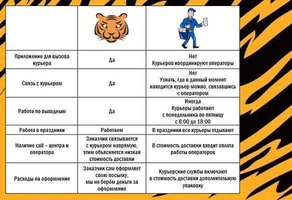 Как понять, что посылку забирает человек из «Тигра», а не посторонний? твет: Все курьеры «Тигра» работают по принципу такси Uber — у них нет формы или фирменной бейсболки. После оформления заявки на забор и доставку посылки на сайте tigr.kz каждый заказчик получает номер телефона курьера, по которому можно будет связываться с ним.