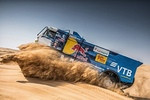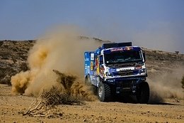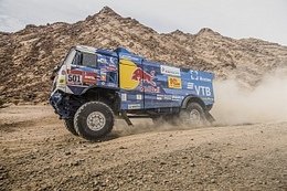 образом, члены экипажей в штатном режиме провели техобслуживание своих машин и отправились отдыхать. Позитива добавил и результат на трассе: первое, второе, третье и пятое места по итогам седьмого этапа, а также укрепление лидирующих позиций в генеральной классификации грузового зачёта. Таблица чётко показывает серьёзное преимущество Дмитрия Сотникова над идущим четвёртым Алешем Лопрайсом. Более 80 минут ходом чеху отыграть будет непросто (а перед ним есть ещё Антон Шибалов и Айрат Мардеев), однако, это «Дакар», и ни о какой расслабленности на оставшиеся этапы не может быть и речи. Условия марафона крайне коварны, никто не знает, что ждёт гонщиков впереди при пересечении острых, как бритва, камней или при штурме опасных дюн, скрывающих за своим гребнем резкий обрыв. Малейшая ошибка экипажа или нестандартная ситуация на трассе грозят оставить машину в плену пустыни, а минуты, ускользающие, как песок сквозь пальцы, рискуют превратиться в долгие часы ремонта и поставить точку в борьбе за «Золотого бедуина». Эти слова подтвердит аргентинец Николас Кавильяссо: лидер зачёта квадроциклов после первой половины «Дакара» опережал ближайшего конкурента на 33 минуты, но за 100 км до финиша первого марафонского этапа проблемы со сцеплением вынудили его оформить сход. Несмотря на жёсткий график, иногда у спортсменов появляется время ознакомиться с тем, что происходит вокруг бивуака (без возможности покинуть закрытую территорию), изучить место, куда их в очередной раз забросил ралли-марафон. Город Сакака, окружённый со всех сторон пустыней Большой Нефуд, стал самой северной точкой в ближневосточном «Дакаре», после переезда из Южной Америки, проходящего в Саудовской Аравии во второй раз. История этого места уходит далеко в прошлое: первые люди останавливались здесь более 6000 лет назад и оставили после себя сооружения из 50 огромных каменных колонн, получивших название Аль-Раджаджил. Благодаря этим древним строениям, имеющим сходство с британским Стоунхенджем, велось наблюдение за звездами. Кому точно не нужно строить свой путь по небесным светилам из точки А в точку Б, так это участникам «Дакара». При прохождении заданного организаторами маршрута современные штурманы ориентируются на дорожную книгу, в этом году впервые ставшую электронной. Навигационный опыт и умение находить верный курс по привязкам на восьмом спецучастке ралли становилось важным условием успешного завершения гоночной дистанции. 375-километровый отрезок на время, вошедший в состав 709-километрового этапа, изобиловал большим количеством высохших русел рек, каньонов и горными породами. Вкупе со стартом грузового зачёта следом за джипами сложности добавляли густая пыль и многочисленные следы, сбивающие преследователей с правильной дороги. Исполнять роль открывателей своей категории выпало КАМАЗам Дмитрия Сотникова, Айрата Мардеева и Антона Шибалова. Результат, достигнутый за предыдущие семь дней гонки, позволял россиянам избегать ненужного риска и ехать по дистанции в удобном для себя темпе. При таких раскладах атаковать приходилось тем, кто расположился в генеральной классификации позади. В том числе и Андрею Каргинову, со старта и до 161-го км опережавшего на считанные секунды Алексея Вишневского. В дальнейшем белорус перехватил лидерство и удерживал его до 310 к