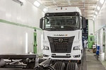 В июле 2017 года в рамках проекта «Реинжиниринг автопроизводства» было составлено техническое задание на разработку и поставку окрасочного комплекса. После проведения тендерных процедур в 2019 году началась поставка оборудования и его монтаж. Благодаря хорошей освещённости порядка 1000 люкс маляры отлично видят все дефекты лакокрасочного покрытия, появившиеся во время сборки, и аккуратно их нивелируют. Система в автоматическом режиме поддерживает оптимальный для покраски уровень влажности 45% при температуре 20 °C. Повышению качества окраски способствует также особая система очистки воздуха – сухая фильтрация. Аэрозоль из окрасочных пистолетов придавливается мощной системой вентиляции через подножные решётки, затем проходит через три фильтра и только потом отправляется в атмосферу. Трёхступенчатую систему очистки имеет и приточная вентиляция. Для исправления дефектов лакокрасочного покрытия в новой камере применяются современные окрасочные пистолеты, позволяющие легко производить регулировку факела. Готова к работе и новая установка для смешивания двухкомпонентных окрасочных материалов. «После выбора поставщика эмали она будет запущена в производство. Пока приготовление краски ведётся на прессово-рамном заводе, при этом стойкость готового материала составляет всего 72 часа. И если за трое суток краска не используется полностью, её остаток приходится утилизировать, – пояснил начальник отдела специальных технологий и нормативов автомобильного завода Сергей Сафонов. – После запуска установки эти потери останутся в прошлом, необходимый объём ЛКМ будет изготавливаться непосредственно перед применением». В состав нового комплекса включена и камера сушки. Её габаритные размеры также соответствуют росту большегрузов классов К4 и К5. Четыре горелки обеспечивают равномерный обдув во всех зонах помещения. Сушка нанесённого лакокрасочного покрытия производится при температуре от 60 до 80 °C. Большое внимание разработчики уделили функциональности системы безопасности комплекса. Камера оснащена датчиками, которые контролируют уровень концентрации паров растворителей. При его повышении прозвучит сигнал, оповещающий о создавшейся аварийной ситуации, и оборудование будет отключено. В случае возгорания автоматически включается система пожаротушения. Вместо углекислоты используется мелкодисперсная вода, которая находится в специальных баллонах. Она гораздо безопаснее углекислого газа, но при тушении огня оказывает такой же эффект.