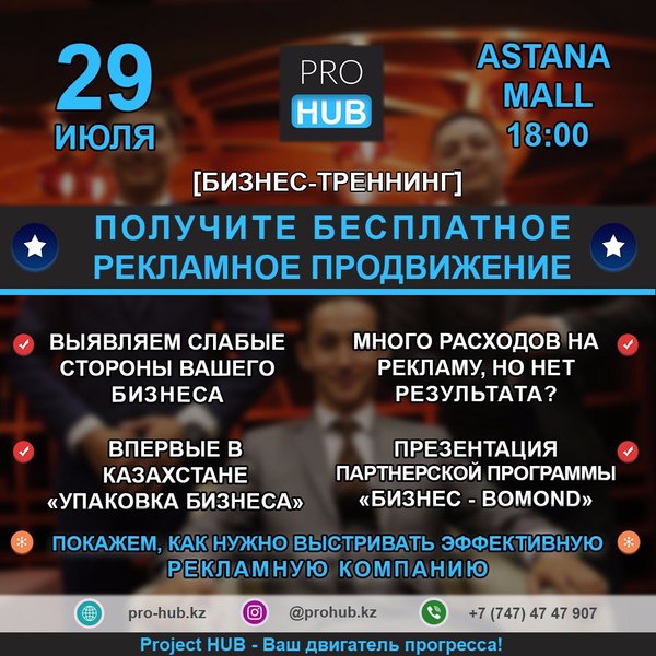 Хотите получить бесплатное рекламное продвижение на 3 месяца? Хотите выявить слабые стороны вашего бизнеса? Много расходов на рекламу, но нет результатов? На нашем тренинге Вы получите: Бесплатный маркетинговый анализ (Выявление слабых сторон) Впервые в Казахстане УПАКОВКА БИЗНЕСА Презентация партнёрской программы «БИЗНЕС — BOMOND » Покажем как нужно выстраивать эффективную рекламную кампанию Project HUB-Ваш двигатель прогресса! 29 июля 18:00 Astana Mall Pro-hub.kz @prohub.kz Тел: