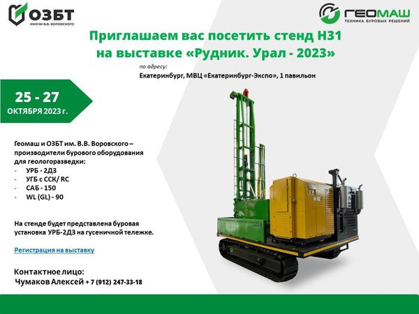 В «Екатеринбург ЭКСПО» завершилась крупнейшая горнопромышленная выставка «Рудник. Урал»». Она собрала 170 поставщиков и производителей оборудования из 57 городов России, Беларуси и Китая. Компания «ГЕОМАШ» совместно с ОЗБТ им. В.В. Воровского представила новинки производства, в частности самоходную буровую установку УРБ2Д3 на гусеничной тележке. В этом году «Рудник. Урал 2023» вырос в два раза по количеству участников в сравнении с прошлым годом. Мы были очень рады увидеться и пообщаться с постоянными участниками и конечно познакомиться с новым… — Читать дальше