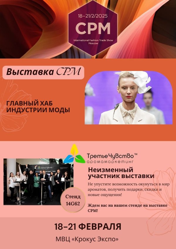 Друзья, по традиции Приглашаем на выставку СРМ! С 18 по 21 февраля в Крокус экспо, в Павильоне 3, Залах 13, 14 и 15 пройдет одно из самых значимых событий в мире моды! Также на выставке состоится выступление Сергея Шабала, генерального директора компании «Третье чувство» Тема: «Ароматизация как инструмент конверсии в торговом зале» Узнайте, как правильно подобранные ароматы могут: Влиять на конверсионные показатели и индекс лояльности Повышать средний чек Создавать уникальную атмосферу и усиливать бренд Наш стенд 14G62 — прих… — Читать дальше
