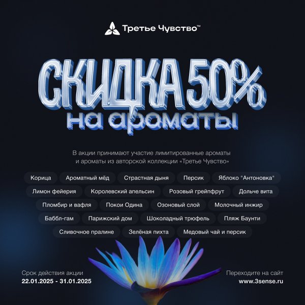 ности, и сейчас самое время преобразить ваше пространство! Не упустите свой шанс! Запаситесь ароматами, которые сделают ваш бизнес уникальнее и прибыльнее! Срок действия акции: 22—31 января 2025 г. Заходите на наш сайт и выбирайте свои любимые ароматы уже сегодня!