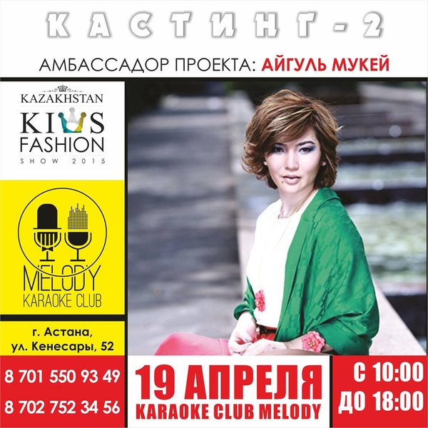 Уже завтра! 19 апреля c 10:00 до 18:00 часов в столичном караоке-клубе Melody состоится второй кастинг для проекта Kazakhstan Kids Fashion Show 2015, который станет отборочной площадкой для детей – моделей в категории 6+. Все подробности на сайте