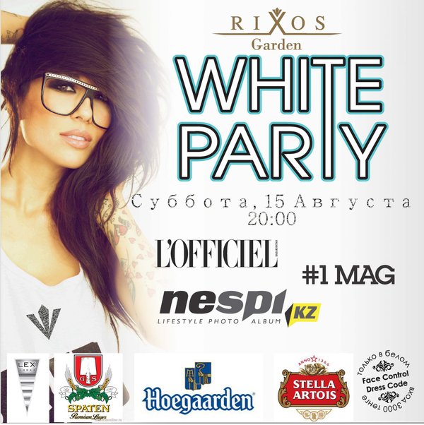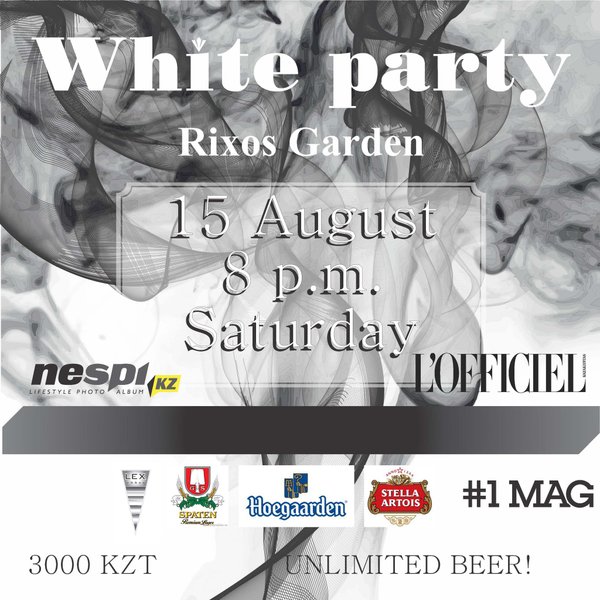 WHITE PARTY В RIXOS GARDEN Неограниченное количество пива с 21:00 до 23:00 Бокал игристого вина для дам, DJ, мастер класс по сальсе, зумба шоу, лотерея Суббота, 15 августa, 20:00 Вход 3000 тенге