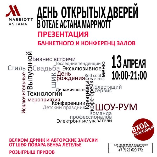 13 апреля ДЕНЬ ОТКРЫТЫХ ДВЕРЕЙ в Marriott Astana Hotel. Последние мировые тенденции и уникальные разработки компании Marriott International в сфере проведения мероприятий. Приходите, будет интересно!