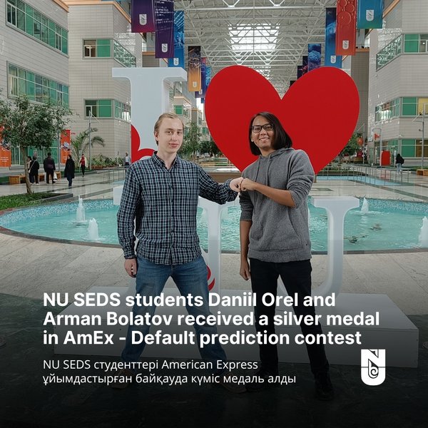 абыс тілейміз! EN NU SEDS students Daniil Orel and Arman Bolatov received a silver medal in the American Express contest. AmEx payment company has organised a credit default prediction competition by building a top machine learning solution. 4875 teams from different countries participated in this contest. «The task was to use anonymised client factors to predict the default of this client over six months. We took silver and 209th place among all participants», shared Danіil about his experience. We wish our students further success in their endeavours! RU Студенты NU SEDS Даниил Орел и Арман Болатов получили серебряную медаль в конкурсе от American Express. Платежная компания организовала конкурс прогнозирования кредитных дефолтов путем создания лучшего решения с помощью машинного обучения. В конкурсе приняли участие 4875 команд из разных стран. «Если подробнее говорить о задаче, то в рамках этого конкурса нужно было используя анонимизированные факторы клиентов за 6 месяцев предсказать дефолт этого клиента. У нас серебро и 209-ое место», — поделился Даниил своим опытом. Мы желаем нашим студентам дальнейших успехов в их начинаниях!