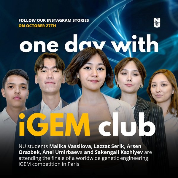 inning 3 Gold, 1 Silver and 2 Bronze medals. The team also organized many scientific events ranging from BioArt exhibitions to Biohackathons and started social initiatives on inclusive education (@remisee_nu). Парижден Bonjour! Ертең, @nuedukz парақшасында, студенттеріміз Малика Василова, Ләззат Серік, Арсен Оразбек, Анель Өмірбаева және Сәкенғали Қажиевпен IGEM биоинженерия жарысының финалына қатысу үшін Франциядағы таңғажайып сапарына қосылыңыз! Назарбаев Университетіндегі IGEM бұл Орталық Азияда және одан тыс өңірлерде синтетикалық биология мен биоинженериямен айналасып, оны кең танымал етуге тырысатын студенттік ұйым. 2014 жылдан бастап студенттер жыл сайын IGEM атты гендік инженерия бойынша Дүниежүзілік жарысқа қатысып, қазіргі уақытта 3 алтын, 1 күміс және 2 қола медаль иегерлері алды. Сонымен қатар, команда Биоөнер көрмелерінен биохакатондарға дейін көптеген ғылыми іс-шараларды сәтті ұйымдастырды және инклюзивті білім беру үшін әлеуметтік бастамаларды бастады (@remisee_nu). Bonjour из Парижа! Присоединяйтесь завтра, на странице @nuedukz, к нашим студентам Малике Василовой, Ляззат Серик, Арсену Оразбеку, Анель Умирбаевой и Сакенгали Кажиеву в их удивительном путешествии по Франции для участия в финале международного соревнования по биоинженерии iGEM! Клуб iGEM Назарбаев Университета – это студенческая организация, занимающаяся практикой и популяризацией синтетической биологии и биоинженерии в регионе Центральной Азии и за его пределами. Начиная с 2014 года студенты ежегодно участвуют во всемирном соревновании по генной инженерии iGEM, завоевав на данный момент 3 золотых, 1 серебряную и 2 бронзовые медали. Команда также успешно организовала множество научных мероприятий, от выставок БиоИскусства до биохакатонов, и запустила социальные инициативы по инклюзивному образованию (@remisee_nu).