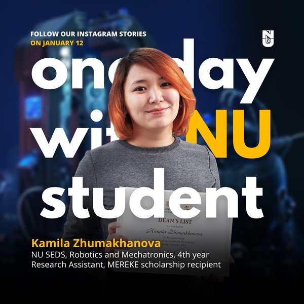 ылыми қызметкердің күнделікті өмірi туралы; және НУ студенті ретінде “Өмір сүр. Сүй. Биле” деген ұранымен өмір сүруiдің қандай болатыны туралы айтамын. Кездескенше! Hello everyone! My name is Kamila Zhumakhanova @camipedia and I am a 4th year Robotics and Mechatronics student. What you need to know about me: ▫ top 2 Robotics student; ▫ 1.5 year of working experience as research assistant in Institute of Smart Systems and Artificial Intelligence and Astana Laboratory of Robotics and Intelligent Systems; ▫ active member of NU Latino Social Dance Club. On Jan 12 you’ll see me on “One day with NU student” insta stories. There, I’ll be sharing my experience of: being a roboticist and working as a research assistant; just being a student of NU and living with a motto “Live. Love. Dance.” See you there! Всем привет! Меня зовут Камила Жумаханова @camipedia, я студентка 4 курса по специальности “Робототехника и Мехатроника”. Коротко обо мне: ▫ вхожу в топ 2 студентов по моей специальности; ▫ опыт работы научным сотрудником 1.5 года в Institute of Smart Systems and Artificial Intelligence и Astana Laboratory of Robotics and Intelligent Systems; ▫ активный участник студенческого клуба Латиноамериканских танцев. 12 января мы с вами встретимся в историях “One day with NU student”, где я расскажу о: буднях робототехника и работе научным сотрудником; да и просто о том, каково это — быть студентом НУ и жить под девизом “Живи. Люби. Танцуй.” Увидимся!