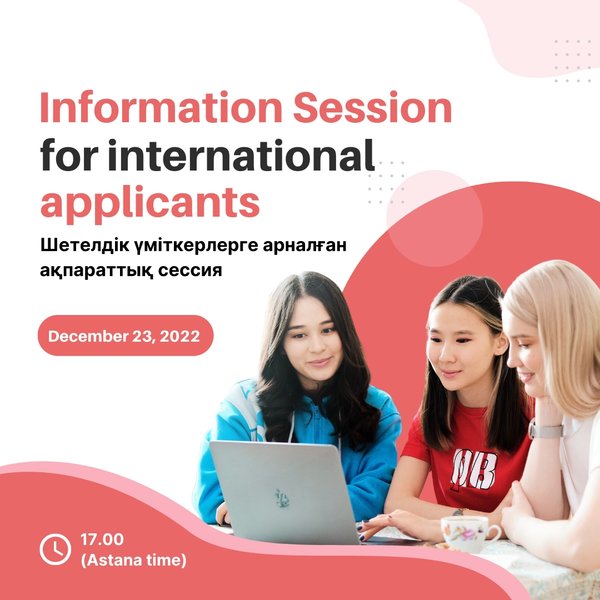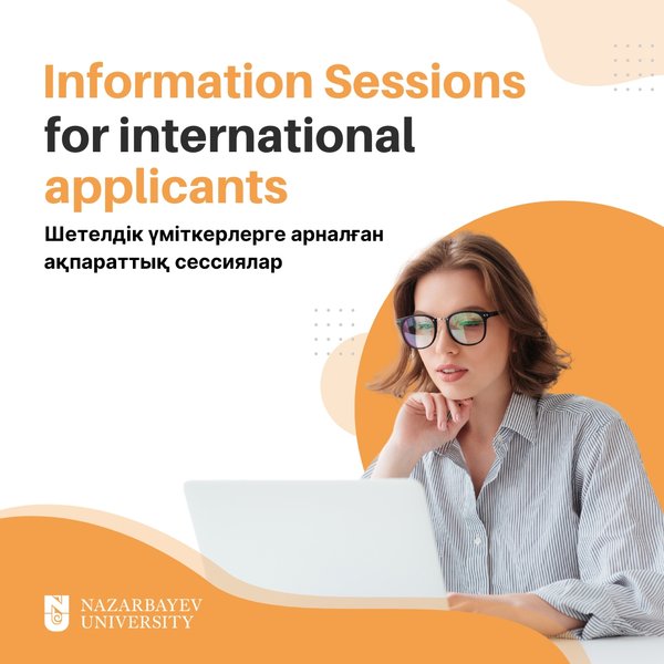 етін шетелдік үміткер болсаңыз, сізді шетелдік үміткерлерге арналған Ақпараттық сессиямызға шақырамыз! Ақпараттық сессия барысында сіз біздің академиялық бағдарламалар, қабылдау талаптары, қаржыландыру мүмкіндіктері және визалық қолдау туралы барлық сұрақтарыңызға жауап ала аласыз. Сессия 2022 жылғы 23 желтоқсанында сағат 17.00-де (Астана уақыты бойынша) Zoom платформасында өтеді. Іс-шараға тіркелу үшін сілтеме арқылы өтіңіз. Сізбен кездесуді асыға күтеміз! RU Вы иностранный абитуриент, который желает учиться в NU? Тогда мы бы хотели пригласить Вас на нашу Информационную сессию для международных кандидатов! Во время инфосессии у Вас будет возможность узнать о наших академических программах, вступительных требованиях, грантах и визовых вопросах. Сессия состоится 23 декабря 2022 года в 17.00 (по времени г.Астана) на платформе Zoom. Просим пройти по ссылке для регистрации на мероприятие. Мы с нетерпением ждем встречи с вами!