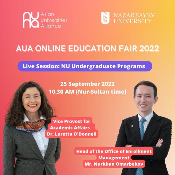 elements of undergraduate study at Nazarbayev University in Kazakhstan, including research integrated teaching, graduate attributes, our focus on academic and research integrity, and opportunities for innovation and startups for undergraduate students. Head of the NU Office of Enrollment Management, Mr Nurkhan Omarbekov, will describe the NU Foundation year program and undergraduate programs at NU. He will also answer all questions about the admissions process, including applying for scholarships for international students, student life on campus and research opportunities for undergraduate students. KZ Екінші жыл қатарынан Азия университеттері Альянсының (AUA) барлық мүше-университеттері бірлескен білім беру көрмесін өткізіп келеді. Көрменің ресми сайтында сіз Азияның 15 жетекші университеттерінің қабылдау комиссиялары ұсынған қабылдау туралы ең маңызды ақпаратты және бейнероликтерді таба аласыз. Назарбаев Университеті тікелей көрсетілімді 2022 жылғы 25 қыркүйекте таңғы сағат 10.30-да (Астана қаласының уақыты бойынша) жоспарланады. Сессия ClassIn платформасында өтеді (қолдану нұсқауы сілтемеде қол жетімді). NU Академиялық мәселелер жөніндегі вице-проректор доктор Лоретта О'Доннелл Назарбаев Университетінің Қазақстандағы бірегей оқу элементтері, оның ішінде зерттеулермен біріктірілген оқыту, түлектердің атрибуттары, академиялық және зерттеушілік адалдыққа біздің назарымыз, сондай-ақ бакалавриат студенттері үшін инновациялар мен стартаптар үшін мүмкіндіктер туралы баяндайды. NU Студенттерді қабылдауды басқару Кеңсесінің басшысы Нұрхан Омарбеков NU Foundation year бағдарламасы және NU-дағы бакалавриат бағдарламалары туралы хабарлайды. Сондай-ақ, ол қабылдау процесі туралы барлық сұрақтарға, соның ішінде шетелдік студенттердің стипендияға өтініш беруі, кампустағы студенттік өмір және бакалавриат студенттері үшін зерттеу мүмкіндіктері сұрақтарына жауап береді. RU Уже второй год все члены-университеты Альянса Азиатских Университетов (AUA) проводят совместную образовательную выставку. На официальном сайте выставки вы сможете найти самую актуальную информацию о поступлении и видеоролики, предоставленные приемными комиссиями всех 15 ведущих азиатских университетов. Назарбаев Университет проведет прямую трансляцию 25 сентября 2022 года в 10.30 утра (время города Астана). Трансляция пройдет на платформе ClassIn (инструкция по использованию доступна по ссылке). Вице-проректор NU по академическим вопросам д-р Лоретта О'Доннелл расскажет об уникальных элементах обучения в Назарбаев Университете в Казахстане, включая интегрированное преподавание с исследованиями, атрибуты выпускников, наше внимание к академической и исследовательской честности, а также возможности для инноваций и стартапов для студентов бакалавриата. Руководитель Офиса по управлению набором студентов NU Нурхан Омарбеков расскажет о программе NU Foundation year и программах бакалавриата в NU. Он также ответит на все вопросы о процессе поступления, включая подачу заявления на стипендии для иностранных студентов, студенческую жизнь на кампусе и возможности для исследований для студентов бакалавриата.