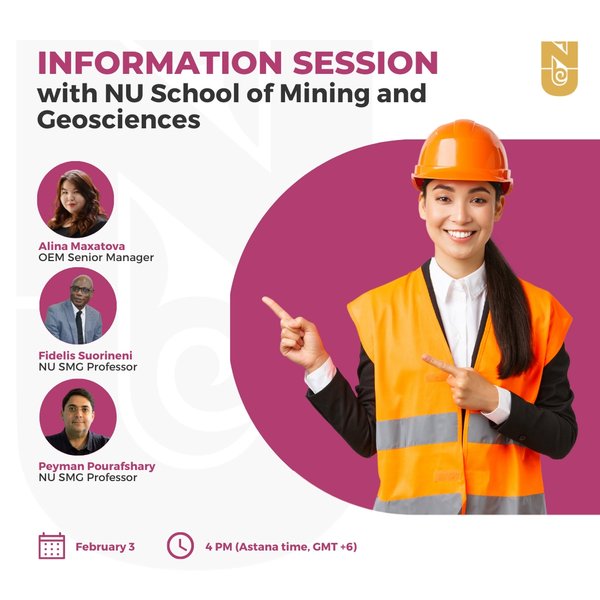 s programs and get some practical tips on admission. February 3, 4 PM (Astana time, GMT +6) For registration, please follow the link. RU Интересуетесь программами Школы горного дела и наук о Земле NU? Тогда присоединяйтесь к информационной сессии с представителями NU SMG, где вы узнаете подробнее о программах Школы и получите практические советы по поступлению. 3 февраля, 16:00 (по времени г. Астана) Регистрация на сессию доступна по ссылке.
