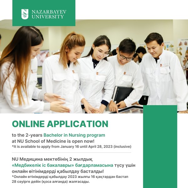 Please register on the admissions.nu.edu.kz portal and complete the requirements. RU Открыт прием онлайн заявок для поступления на двухгодичную программу «Бакалавр сестринского дела» Школы медицины Назарбаев Университета! Прием онлайн заявок доступен в период с 16 января по 28 апреля 2023 года (включительно). Для участия в конкурсном отборе необходимо зарегистрироваться на портале admissions.nu.edu.kz и выполнить соответствующие требования.