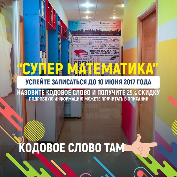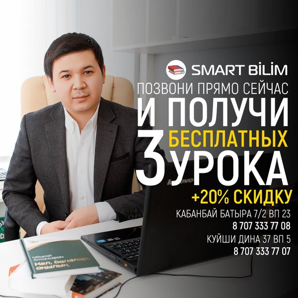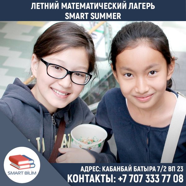 Математический центр «SMART BILIM» продолжает набор в группы. Идёт набор в казахскую группу для 6 класса Вы полюбите математику, приходите на урок и вы убедитесь в этом. Успейте записаться до конца этого года и получите в подарок 3 бесплатных пробных урока ️ _ Адрес: Куйши Дины 37 ВП 5 Номер телефона: ; ️; Адрес: Кабанбай Батыра 7/2 ВП 23 Номер телефона: ; ️; _