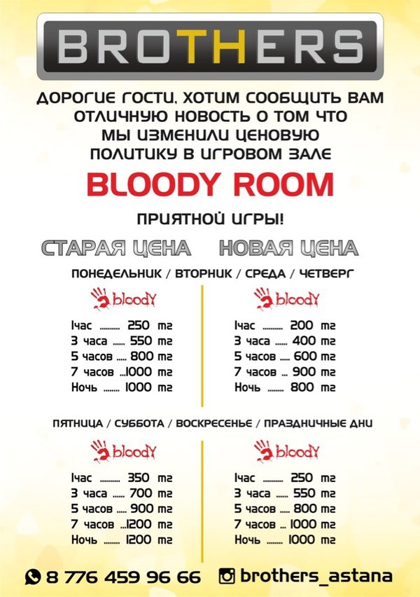 Всем хорошей рабочей недели Погода за окном,как раз располагает заглянуть в Brothers_astana Приятная атмосфера современные и самые любимые игрыНу и конечно VIP комната для особенных гостей Мы ждём Вас по адресу Алтынсарина 5,напротив ТРЦ Арсенал