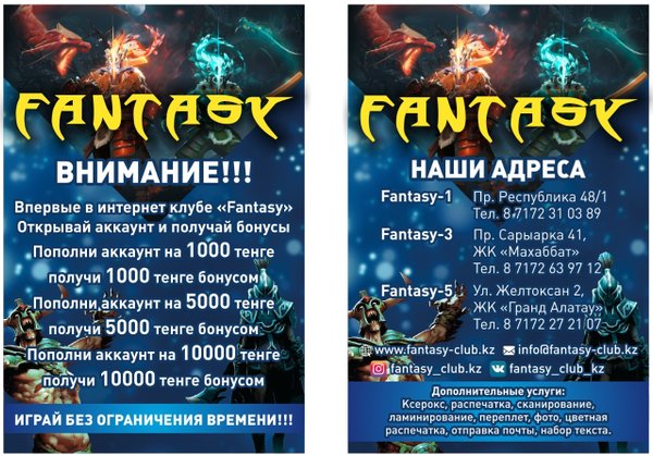 ициальных киберспортивных дисциплин Азиатских игр — 2018. Оцените игру по достоинству в сети игровых клубов Fantasy! ️Наши адреса: • Fantasy 1 — Республика 48/1 • Fantasy 3 — Сарыарка 41 • Fantasy 4 — Мустафина 21/2 • Fantasy 5 — ЖК Гранд Алатау, ул.Желтоксан 2