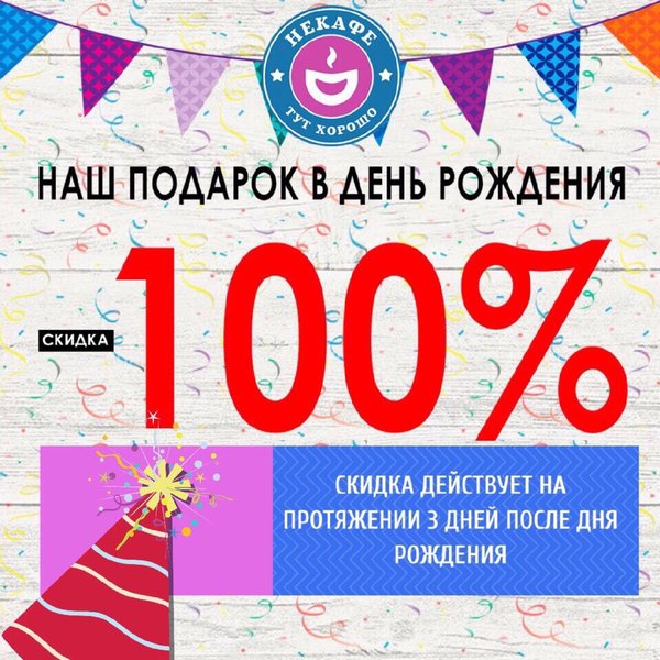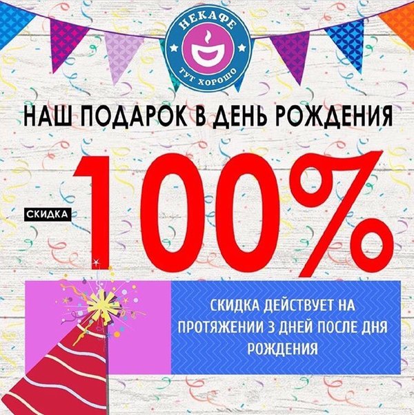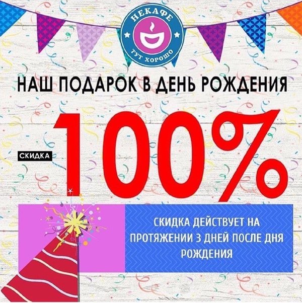 Команда Некафе искренно поздравляет с Вашим днём рождения Пусть любой день Вашей жизни будет наполнен позитивом и оптимизмом, интересными идеями и приятными встречами. И наш подарок для Вас полностью БЕСПЛАТНОЕ ОДНОРАЗОВОЕ ПОСЕЩЕНИЕ Вот же наши счастливчики : Нияз Хусаинов Индира Жарасова Бахыт Бодумова Нурсултан Абдуалиев Никита Дудин Алибек Сайлауов Мария Шмарова Нұрсайын Пиржанов Ростислав Ефременюк Скидка для именинников действует день в день рождения и 3 дня после дня рождения ______________________________________________… — Читать дальше