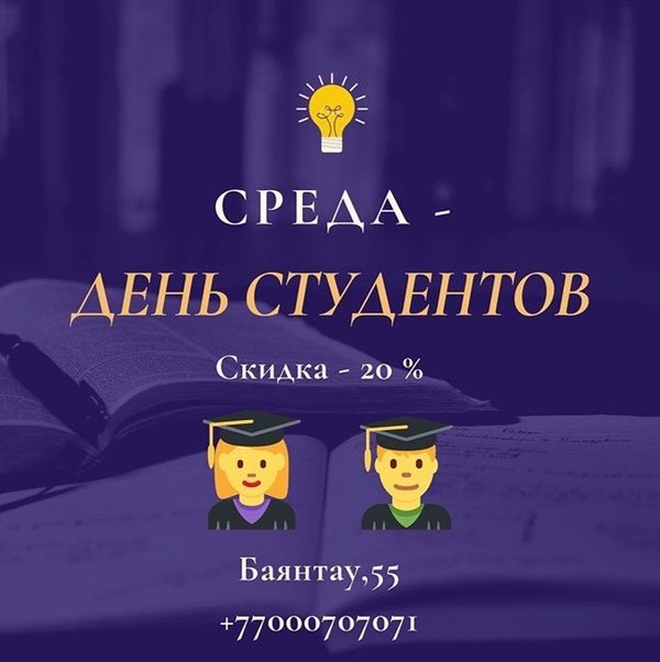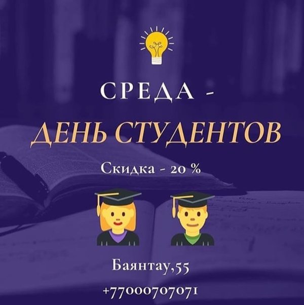 Сегодня СРЕДА — Студенческий день Поэтому нашим дорогим студентам скидка -20% Предъяви студенческий билет администратору и получи свою скидку __________________________________ Адрес: Баянтау,55 Телефон: