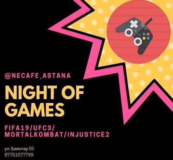 Пятница — Ночь игр Всю ночь играем в настольные игры и рубимся в плойку (ps4) Работаем до 6:00 утра Впереди бессонная ночь ______________________________________ Адрес: Баянтау,55 Телефон: