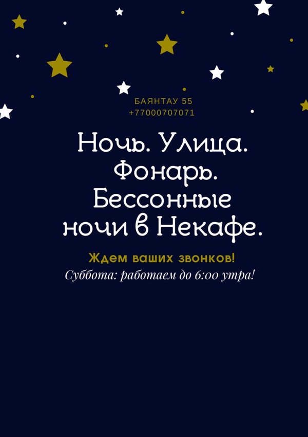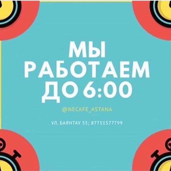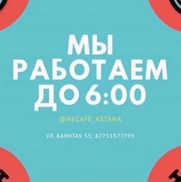 Сегодня — ПЯТНИЦА-Время Тусить Кутить, а значит мы открыты до 6 утра Будем рады каждому гостю Вы готовы к бессонной ночи в Некафе? ————————————————— Адрес: ул. Баянтау 55 (Жумабаева-Момышулы) Телефон:,