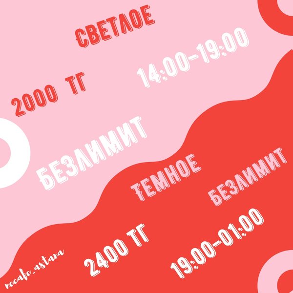 Каждый понедельник вы можете находиться в нашем заведение по фиксированному чеку! ️ Светлое время суток — с 12:00 и до 17:00 вы платите всего 1800тг! Тёмное время суток- с 17:00 и до 00:00 вы отдаёте ВСЕГО 2000! Ну не круто ли? ————————————————— Адрес: ул. Баянтау 55 (Жумабаева-Момышулы) Телефон:,
