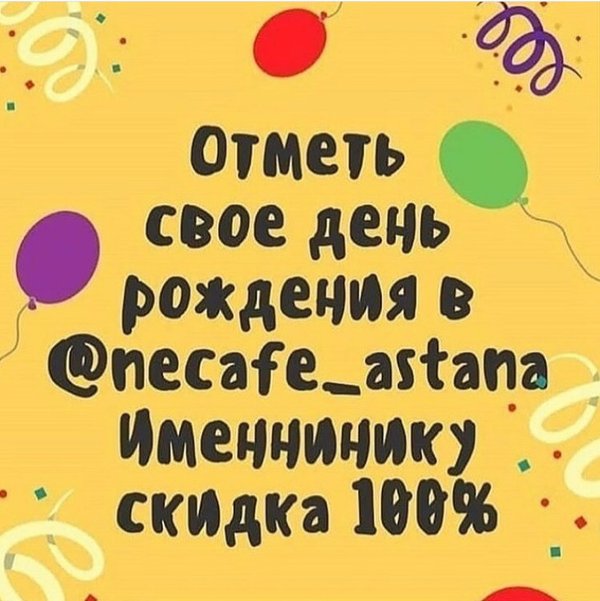 Команда Некафе искренно поздравляет с Вашим днём рождения Пусть любой день Вашей жизни будет наполнен позитивом и оптимизмом, интересными идеями и приятными встречами. И наш подарок для Вас полностью БЕСПЛАТНОЕ ОДНОРАЗОВОЕ ПОСЕЩЕНИЕ Вот же наши счастливчики : Дайана Ахметова Инкар Айманова Дамир Джумабаев Жанара Шиндавлетова Арман Раимбеков Жанара Сагиндыкова Бота Ниязхан Камила Токтарова Erzat Kurlubayev Abu Andabekov Нуралы Тимербек Скидка для именинников действует день в день рождения и 3 дня после дня рождения _____________… — Читать дальше