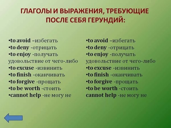 country. Сильвии запрещено покидать страну. — Imagine – Imagine being able to travel in space. – Представьте, что вы можете путешествовать в космосе. — Involve – The trips often involve a lot of walking. – Поездки часто включают в себя много прогулок. — Risk – People in poor districts face the highest risk of being burgled. – Люди в бедных районах сталкиваются с наибольшим риском быть ограбленными. — Suggest – Luke suggested having the meeting at his house. – Люк предложил провести встречу у него дома. — Consider – We’re considering buying a new house. – Мы подумываем о покупке нового дома. Фразовые глаголы и глаголы с предлогами А также выучите наизусть следующие выражения после которых используется герундий: — Object to – возражать; — Boast of – славится; — Complain about / of – жаловаться; — Concentrate on – сосредотачиваться на чем-либо; — Confess to – признаваться; — Depend on – завесить от; — Hear of – ни за что не позволять что-либо; — Look forward to – ждать чего-либо с нетерпением; — Putt of – откладывать; — Rely on – полагаться; — Succeed in – добиваться успеха; — Punish for – наказывать; — Suspect of – подозревать; — Thank for – благодарить; — Help in – помогать; — Praise for – хвалить. Примеры: — We are looking forward to going on this exciting trip. – Мы с нетерпением ждем этого захватывающего путешествия. — The carrying out of these plans depends on the documents being signed in time. – Выполнение этих планов зависит от своевременности подписания документов. Выражения can not help, can not stand и can not bear: — Who could stand being laughed at? – Кто выдержит насмешки?