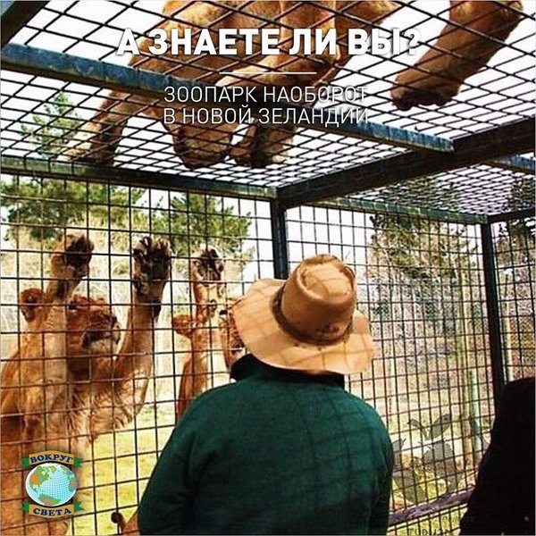 Знаете ли вы, что существует зоопарк наоборот? Ощутить себя жителем такого парка, где посетители – львы и другие хищные животные, можно в зоопарке Орана в Новой Зеландии. Животные тут живут как в естественной среде на площади 80 га. Туристов помещают в клетку и вывозят на фургоне на территорию ко львам. Любопытные хищники обступают «вольер» со всех сторон. Хотите пощекотать свои нервы? __________________ Информацию по турам и новым предложениям узнавайте по адресу: Пр.Абая 8,ВП 22, 407—501, 407—502, .