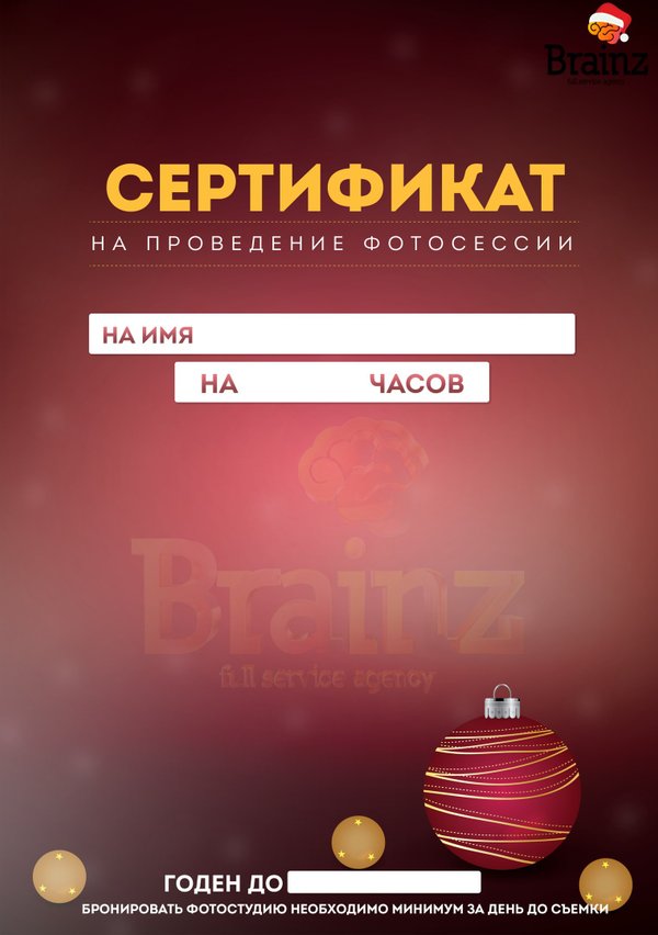 Новый год уже не за горами, а значит, пришло время подумать о новогодних презентах! Подарочные сертификаты для Ваших близких и друзей на проведение фотосессии! Наши контакты:,.