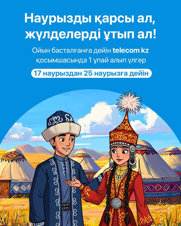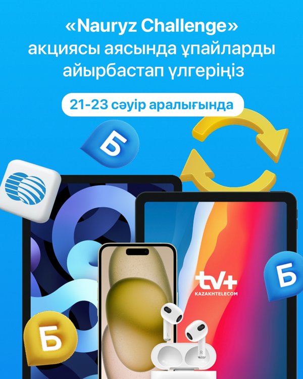 ындалған тапсырма үшін 1 ұпай алыңыз. Қосымша ұпай алу үшін бір күнді де жіберіп алмау керек! «Киіз үйді толтыру» тапсырмасы «Nauryz Challenge„-ге қатысуға шақыру арқылы 5 киіз үйді толтырыңыз. Әр толтырылған киіз үй үшін 1 ұпай аласыз. Барлық тапсырмалар туралы толығырақ алда берілетін бейнематериалда айтатын боламыз. Парақшамызға жазылып, жаңалықтарды қадағалаңыз! AppStore және Google Play желісінен telecom kz қосымшасын жүктеп алыңыз ▪▪▪ Nauryz Challenge стартовал! С 26 марта по 20 апреля выполняйте три разных задания в приложении telecom kz и получите шанс выиграть один из призов iPhone 16 iPad 10-го поколения AirPods 3 Бонусы для оплаты услуг Промокод на подписку TV+ Для участия в розгрыше призов заработайте больше баллов, выполняя все три задания. Задание «Пригласи соседа“ Участвуйте в акции „Пригласи соседа“ и получите 10 баллов за каждого нового подключенного клиента к услугам Казахтелекома. Играйте каждый день в приложении telecom kz! Получайте за каждое выполненное задание 1 балл. Не пропускайте ни одного дня, чтобы получить дополнительный балл! Задание «Заполни юрту» Заполните 5 юрт, приглашая участвовать в «Nauryz Challenge». За каждую заполненную юрту вы получите 1 балл. Подробнее о всех заданиях, мы расскажем в наших следующих видео. Подписывайтесь и следите за обновлениями на нашей странице! Скачайте приложение telecom kz из AppStore и Google Play
