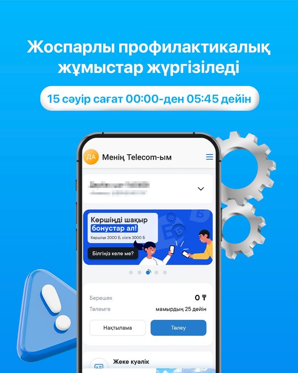 Құрметті клиенттер! Жоспарлы профилактикалық жұмыстарды жүргізуіне байланысты 15 сәуір сағат 00:00 -ден 05:45 -ке дейін telecom.kz сайтына және telecom kz мобильді қосымшасына кіру мүмкіндігіне шектеулер болуы мүмкін. Уақытша қолайсыздықтар үшін кешірім сұраймыз! ▪▪▪ Уважаемые клиенты! В связи с проведением плановых профилактических работ 15 апреля с 00:00 до 05:45 возможно ограничение доступа к сайту telecom.kz и мобильному приложению telecom kz. Приносим извинения за временные неудобства!