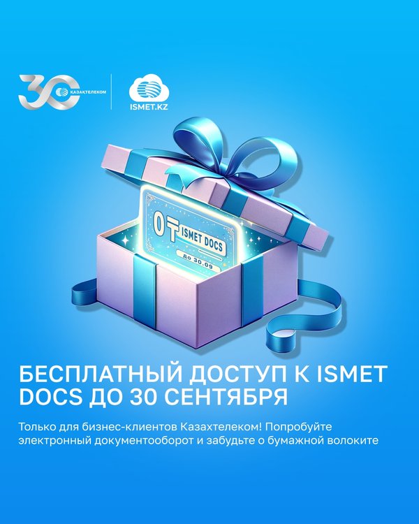 етімділік: Тәуліктің кез келген уақытында әлемнің кез келген жерінен құжаттарға қол жеткізіңіз. Бәрі оп-оңай! docs.ismet.kz кіріп тіркеліңіз және Ismet Docs-пен жұмыс істей бастаңыз Акция 30 қыркүйекке дейін жарамды. Электрондық құжат айналымына өтіп, қағазбастылықтан арылыңыз! ▪▪▪ Бесплатный доступ к Ismet Docs до 30 сентября! В честь 30-летия «Казахтелеком» мы рады предложить нашим бизнес-клиентам уникальную возможность попробовать Ismet Docs абсолютно бесплатно! Почему стоит выбрать Ismet Docs? Конфиденциальность: Только Вы имеете доступ к своим документам. Безопасное хранение: Ваши документы хранятся в защищенном Data Center уровня Tier III. Защита: Документы защищены от природных и техногенных катастроф. Надежное хранение: Важные договоры и контракты всегда в безопасности. Доступ 24/7: Получите доступ к документам из любой точки мира в любое время суток. Все просто! Переходите на docs.ismet.kz, регистрируйтесь и начните работать с Ismet Docs Акция действует до 30 сентября. Переходите на электронный документооборот и забудьте о бумажной волоките!