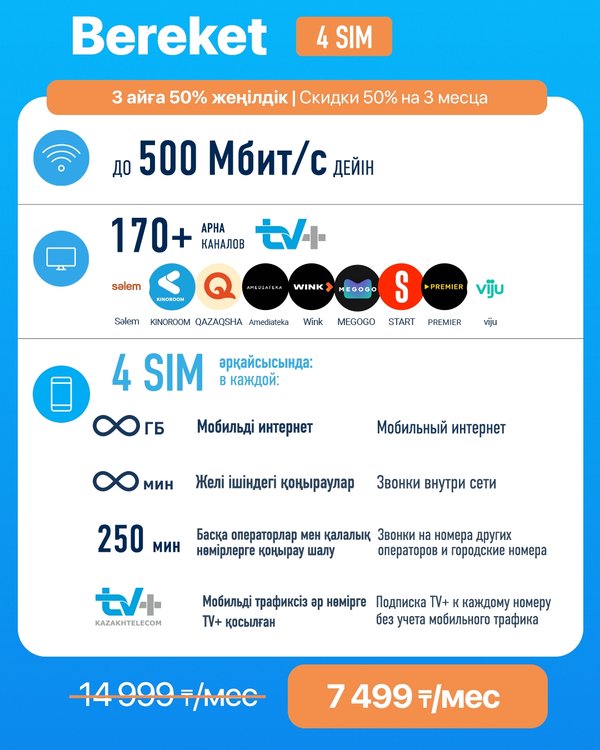КА 50% НА 3 МЕСЯЦА! Суперпредложение от Казахтелеком Новые клиенты получат скидку 50% на 3 месяца при подключении к пакетам услуг Bereket, Keremet Mobile или Keremet TV. Наслаждайтесь скоростным интернетом, качественной мобильной связью и широким выбором контента TV+ по выгодной цене. Полное наполнение пакетов услуг Bereket, Keremet Mobile и Keremet TV смотрите в наших карточках Скидка 50% действует 90 дней с момента подключения и распространяется только на пакет услуг с 3-летним контрактом.