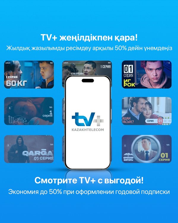 у на 6 или 12 месяцев, и вы сэкономите до 50%. Вы получите доступ к широкому выбора контента: свыше 5 000 фильмов и сериалов, спортивные трансляции, мультфильмы на казахском языке и премьеры от Sәlem Entertainment Выбрать вариант подписки можно в приложении TV+ Экономия и удовольствие – два в одном! Наслаждайтесь просмотром любимого контента по супервыгодной цене! Приложение TV+ доступно для скачивания: