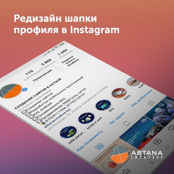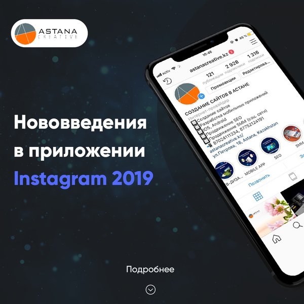 ечение. Маски могут быть разнотипные: бьюти маски, макси бренды, маски игры, маски вопросники и многое другое. Самое важное – теперь создание масок доступно каждому пользователю. Создаются маски в приложении Spark AR Studio. 3⃣ Наличие интересных текстов На сегодняшний день, наличие просто красивой фотографии – это очень мало для пользователей, нужен завораживающий или интересный текст под фото, возможно оно не будет связано с фото, но будет привлекать внимание пользователей на прочтение. Самые интересные темы для постов: подборка фильмов, книг, мест посещения, различные советы, опросники, анализы, откровения или даже переживания. 4⃣ Наличие видео-контента Как уже ранее говорилось, Инстаграм особое внимание уделяет видео-контенту и его продвижению. Исследования показали, что видео-контент имеет больше вовлеченности, чем обычная картинка или фото. 5⃣ Оформление шапки профиля Пример: Заголовок, который содержит ключевой запрос. По которому могут вас искать в поиске Инстаграм. Далее краткое описание о компании или личности. Далее следуют полезные ссылки на сайты или страницы. И самое важное — это составление ряда актуальных историй, которые могут содержать адреса, контакты, цены и тп. 6⃣ Коллаборации, розыгрыши, гивы Как можно заменить по последним публикациям блогеров и звезд, то постоянно проводятся множество гивов, розыгрышей. От подписчиков требуется только максимальная активность. ______________________________ Веб-студия «Astana Creative» ул. Петрова 18, офис 502