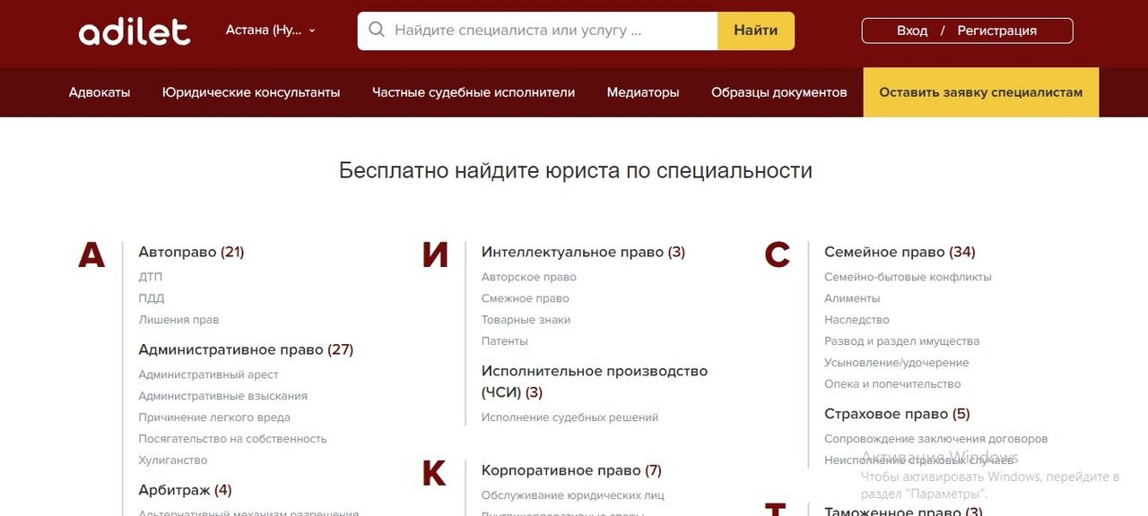 ADILET.KZ — бесплатный сервис по поиску юристов и адвокатов Казахстана. Если вы ищете юридические услуги в Астане, Алматы или в других городах Казахстан то найдете их у нас на сайте. Бесплатная юридическая консультация и онлайн консультация это те услуги которые окажут наши опытные юристы.