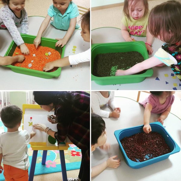 Детки-непоседы с младшей группы «Бал-бала» получили огромную радость от поиска фигурок в крупах и наклеивании их на бумагу