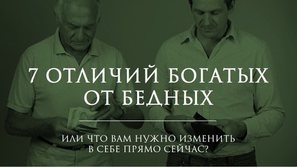 корень всякого зла. Богатые же люди считают бедность корнем всех зол. Слышали ли вы такое: «Я никогда не буду зарабатывать таким образом Это не моё.»? Скажу так: если ваша цель – зарабатывать больше, так почему вы находите отговорки? Хотите богатства – зарабатывайте. И никаких оправданий. 2. Богатые люди считают эгоизм добродетелью, бедные – пороком. Все мы так или иначе эгоистичны. Могу в данном случае выделить явный и скрытый эгоизм. Так вот, явный – это когда вы говорите прямо: «Я хочу это, это мой путь, и я готов по нему идти». – Отлично, здорово! Вы придёте! Но вот скрытый эгоизм – это когда вы вроде бы и хотите достичь чего-то, но о своих планах не заявляете ни себе, ни окружающим А что в итоге? 3. Богатые – люди действия, бедные – ждут чуда или выигрыша. «Эх, вот бы выиграть много денег Вот бы получить шанс Вот бы мне что-то подвернулось!». Даже если вы получите выигрыш, Вы просто потратите деньги. Действия же – принесут инвестиции в виде опыта, знаний, следовательно, «куш» можно сорвать намного больше. Намного больше! 4. Богатые думают о будущем, бедные – о старых добрых временах. «Эх, когда-то было всё так замечательно И доллар по 30 » Я думаю, не надо объяснять, что чем больше мы думаем о будущем, визуализируем, планируем, тем больше вероятность, что всё это станет реальностью. А если ещё и выполнять эти планы, следовать им, то успех, несомненно, в ваших руках. Кстати, мои ученики на падении рубля в 2014 году увеличили свои капиталы в 2 раза. Их долларовые капиталы остались на том же уровне, однако в рублях сумма как раз и выросла в 2 раза. (отсылка к 3 пункту) 5. Богатые люди следуют страсти. Бедные – занимаются тем, что им не нравится. Скорее, богатым подходят слова «одержимость» или «увлечённость». И это здорово! Представьте, как вы увлечены чем-то, отдаётесь этому делу, получаете удовольствие, заряжаетесь энергией! Было бы здорово, не так ли? «Да, но 8-часовой рабочий день, пятидневка отпуск раз в 2 года » — Прекратите. Вы достойны большего. 6. Богатые заботятся о своих деньгах. Бедные – безрассудно тратят при первой возможности. Под заботой я подразумеваю строгий контроль и грамотные инвестиции, которые в будущем приносят всё больший и больший доход. За примерами далеко ходить не нужно: все богатейшие люди планеты львиную долю своих капиталов сколотили на инвестициях (Уорен Баффет, Дональд Трамп, Бенджамин Грэхем). Секрет этих людей в том, что деньги работали на них, а не наоборот. 7. Богатые люди, помимо университетского образования, ищут возможности получения специфических знаний. В университете нас не учат зарабатывать. Если вам нужны деньги, то, пожалуйста, ищите и другие возможности, воспитывайте себя и не останавливайтесь на одной точке. К примеру, хотели бы вы заработать миллион? Если хотели, то почему до сих пор не нашли необходимую информацию? Специально для вас мы подобрали интересный для изучения материал, после которого вы сможете и миллион заработать, и пассивный доход получать с него – 8—10%. Интересно? Вот ссылка: P.S. Начните меняться хотя бы с этого. Примените только половину этих рекомендаций, спокойно создадите капитал в 200 000 рублей, даже если сейчас у вас нет денег.