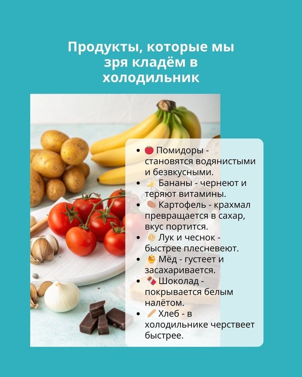 . Им нужна сухая и прохладная среда. Мёд — густеет и засахаривается. Достаточно тёмного шкафа. Шоколад — в холоде «седеет» (покрывается белым налётом). Храните в прохладной комнате. Хлеб — в холодильнике он быстро черствеет. Лучше — хлебница или заморозка порциями. Совсем не обязательно «прятать всё в холод». У каждого продукта есть своё «любимое место» для хранения. И если вы хотите сохранить вкус и пользу, дайте еде те условия, в которых она чувствует себя лучше всего. А вы тоже когда-то держали бананы и помидоры в холодильнике?