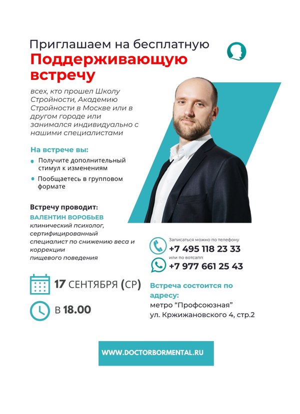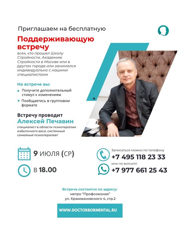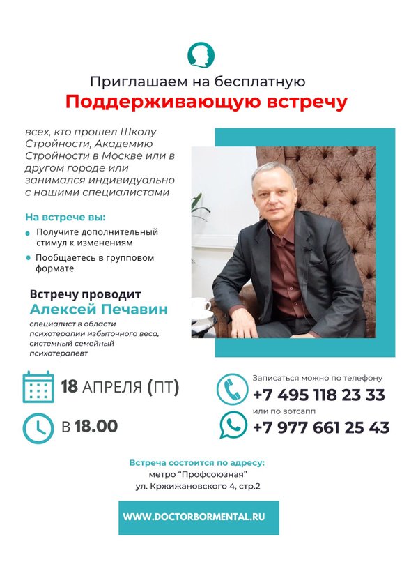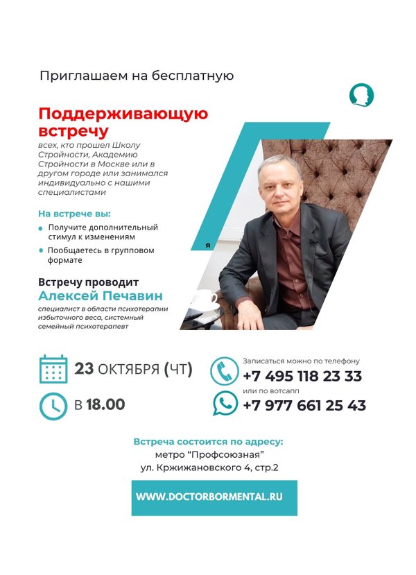 Где: Москва, м. Профсоюзная, ул. Кржижановского, 4, стр. 2 Кто ведёт: Алексей Печавин — специалист по психотерапии избыточного веса, системный семейный психотерапевт. Стоимость: бесплатно для всех, кто был и кто сейчас в программе. Хочешь прийти? Запишись: