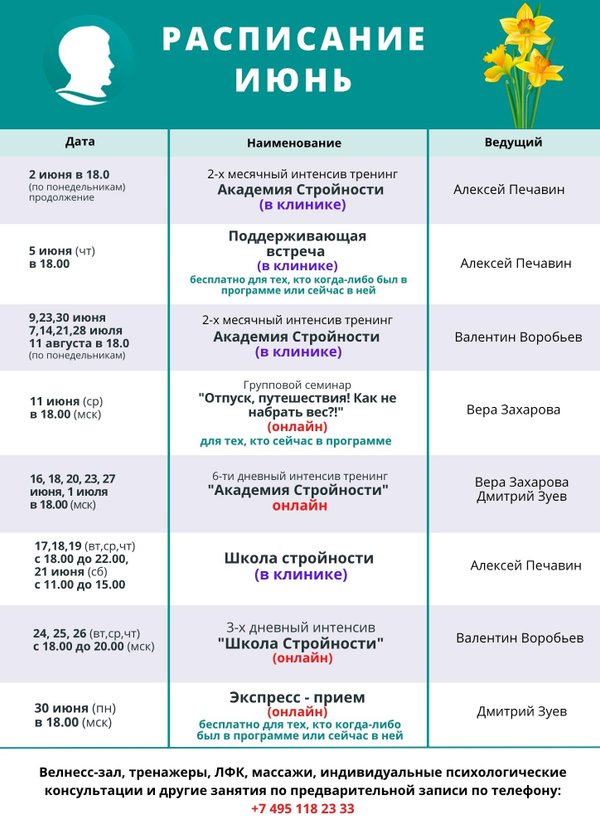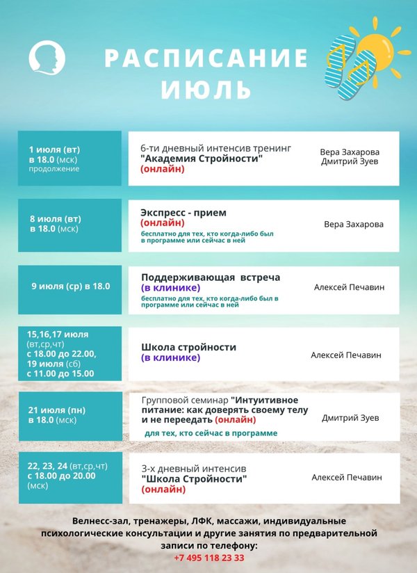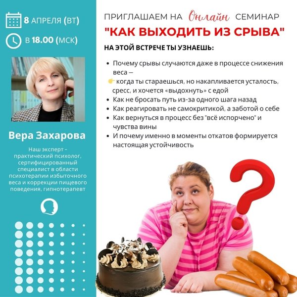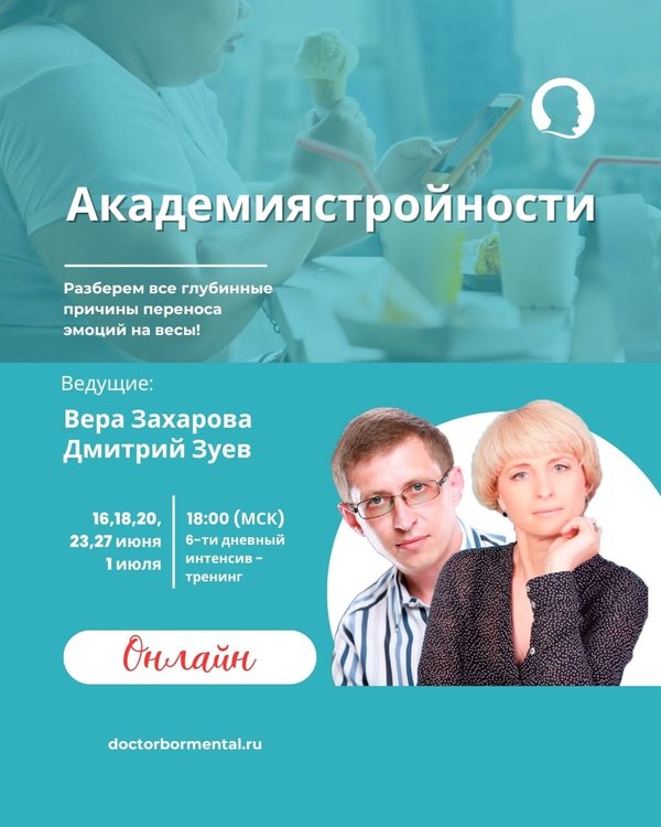 — психологический тренинг, где вместо борьбы с собой будет: мягкое принятие глубокая внутренняя работа конкретные техники для того, чтобы жить стройно — спокойно и стабильно. Встречи: 16, 18, 20, 23, 27 июня и 1 июля в 18:00 (МСК) — онлайн (Успей присоединиться с любого уголка страны — даже из отпуска!) Кому точно стоит быть с нами: Вес стоит, и ты чувствуешь, что «застряла» Ты снижаешь вес, но еда продолжает «звать» Эмоции часто ведут к срывам Есть ощущение, что без «волшебного пинка» не пойдешь дальше Хочется стабильности, не качелей Что будет на встречах: Психологические техники по работе с аппетитом Разбор глубинных причин «переноса эмоций на еду» Работа с самооценкой, самоподдержкой, мотивацией Антистрессовые и расслабляющие практики Общение с экспертами и живыми людьми «в теме» Честные разговоры о страхах, тяге, застревании И самое главное — ты не одна (не один). Мы рядом. И у тебя получится. Ведущие тренинга — Вера Захарова: психолог, гипнотерапевт, тренер по снижению веса с душой. С более чем 22-х летним опытом работы в психотерапии лишнего веса и эмоционального аппетита. — Дмитрий Зуев: практический психолог, специалист по психотерапии переедания. С более чем 15-летним опытом в работе с психосоматикой и изменением установок на здоровое поведение. Готовы продолжить свой путь к идеальной форме? Записывайтесь на тренинг прямо сейчас и делайте следующий шаг к своей мечте! Мы вас ждём! Подробности по телефону: или пишите нам в WhatsApp: мы всегда на связи!
