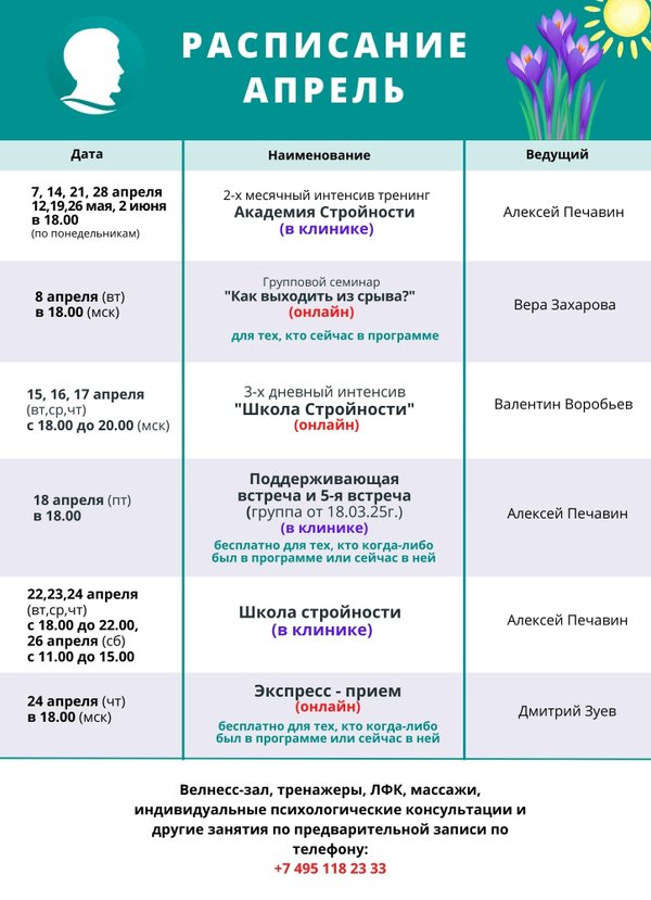 5 июня в 18:00 приглашаем вас на бесплатную поддерживающую встречу с Алексеем Печавиным @a.pechavin — системным семейным психотерапевтом и специалистом по снижению веса. Если вы были в Школе Стройности, Академии или занимались с нашими специалистами — приходите. Это вечер для вдохновения, поддержки, честных разговоров и новых шагов к себе. Адрес: метро Профсоюзная, ул. Крижижановского 4, стр.2 Запись по телефону: или в WhatsApp: Забота о себе — это путь, на котором важно не быть одному. Мы рядом.. Идти по нему легче вместе. Ждём… — Читать дальше