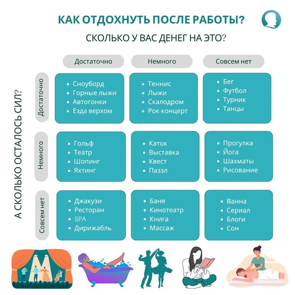 но заряжает внутреннюю батарейку. СИЛ МАЛО, НЕТ Йога, прогулка, шахматы, рисование. Легко, медленно, по-настоящему. СИЛ НЕТ, ЕСТЬ Погружаемся в SPA, массаж, ресторан или даже дирижабль? (ну а почему бы и нет?) СИЛ НЕТ, МАЛО Баня, кино, книга, чай, плед, тишина. Золотой набор интроверта. СИЛ НЕТ, НЕТ Ванна, сериал, блоги и сон, наконец-то сон. Напиши в комментариях: Где ты сейчас на этой матрице? И какой отдых тебе нужен прямо сегодня?