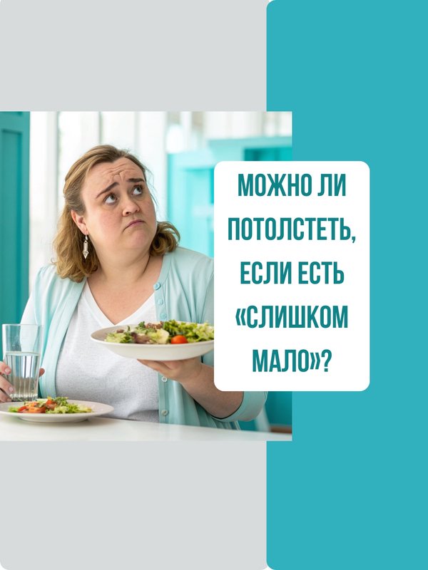 ес ↓ Это факт, подтверждённый десятками исследований. Но есть нюанс: человек плохо считает и еду, и расход. Почему возникает путаница? 1. Сложно точно измерить метаболизм • Фитнес-браслеты, тренажёры, таблицы калорий часто ошибаются на 20–30%. • Настоящая точность возможна только в лаборатории (метаболическая камера). 2. «Я ем мало». Что это значит? • меньше, чем обычно? • меньше, чем «сказали» в интернете? • меньше, чем «правильно»? • меньше за день, за неделю? • меньше, чем реальная потребность? Эти понятия разные. Без ясности легко решить, что «ем мало», хотя дефицита калорий нет. 3. Ошибки восприятия Мы склонны: • недооценивать, сколько едим, • переоценивать, сколько тратим. Иногда разница доходит до 50%! Пример: клиент думал, что добавляет в блюдо 2 ст. ложки масла (240 ккал). На деле – 10 ложек (1200 ккал). 4. «Один ужин всё испортил» Рабочие дни недели − 2500 ккал (дефицит). Потом в выходные – «здоровое» блюдо + чизкейк (+4000 ккал). Итог недели: +1500 ккал. Каково чувство? Метаболизм сломан. Реальность – калории незаметно перекрыли дефицит. Как адаптируется тело при недоедании Когда мы едим меньше чем обычно, организм начинает «подстраиваться»: меньше тратим энергии на переваривание, снижается базовый обмен (тело легче → нужно меньше энергии), меньше двигаемся спонтанно (меньше «ёрзания»), усваиваем больше из еды (пищеварение замедляется). Гормональные петли: аппетит ↑ (хочется есть чаще), насыщение ↓ (сложнее почувствовать сытость), гормоны щитовидки и половые ↓ (замедляют обмен). И вот »−500 ккал» в реальности стало »−200». Плюс: вода и стресс Кортизол (гормон стресса) задерживает воду. Строгая диета = стресс → вес увеличивается, хотя жира может становиться меньше. Визуально: я мягче, значит потолстел. На деле просто отёк, который уйдёт со временем. Индивидуальные различия огромны Даже у двух одинаковых людей расход может отличаться на 200–500 ккал. Генетика, сон, цикл, микробиота, стресс – всё влияет. Формулы дают «среднее», а вы не «средний». Что делать на практике Считайте честно: с помощью ладони, ложек, весов, фото. Добавьте осознанность: 5 -7 дней трекинга открывает глаза. Будьте добрее к себе: ошибки бывают у всех, не корить себя. Больше цельных продуктов: овощи, фрукты, бобовые, белок → насыщают сильнее, калорий меньше. Ищите свою схему: кому-то комфортнее больше углеводов, кому-то больше жиров. Ответственность: любое решение имеет последствия. Иногда сладость – это тоже выбор, и это нормально. Итог Нельзя потолстеть, «если ешь слишком мало». Можно недооценивать калории на входе, переоценивать расход и сталкиваться с адаптацией организма. Стратегия: честный учёт, мягкие привычки, сон, стресс и терпение. # малоем